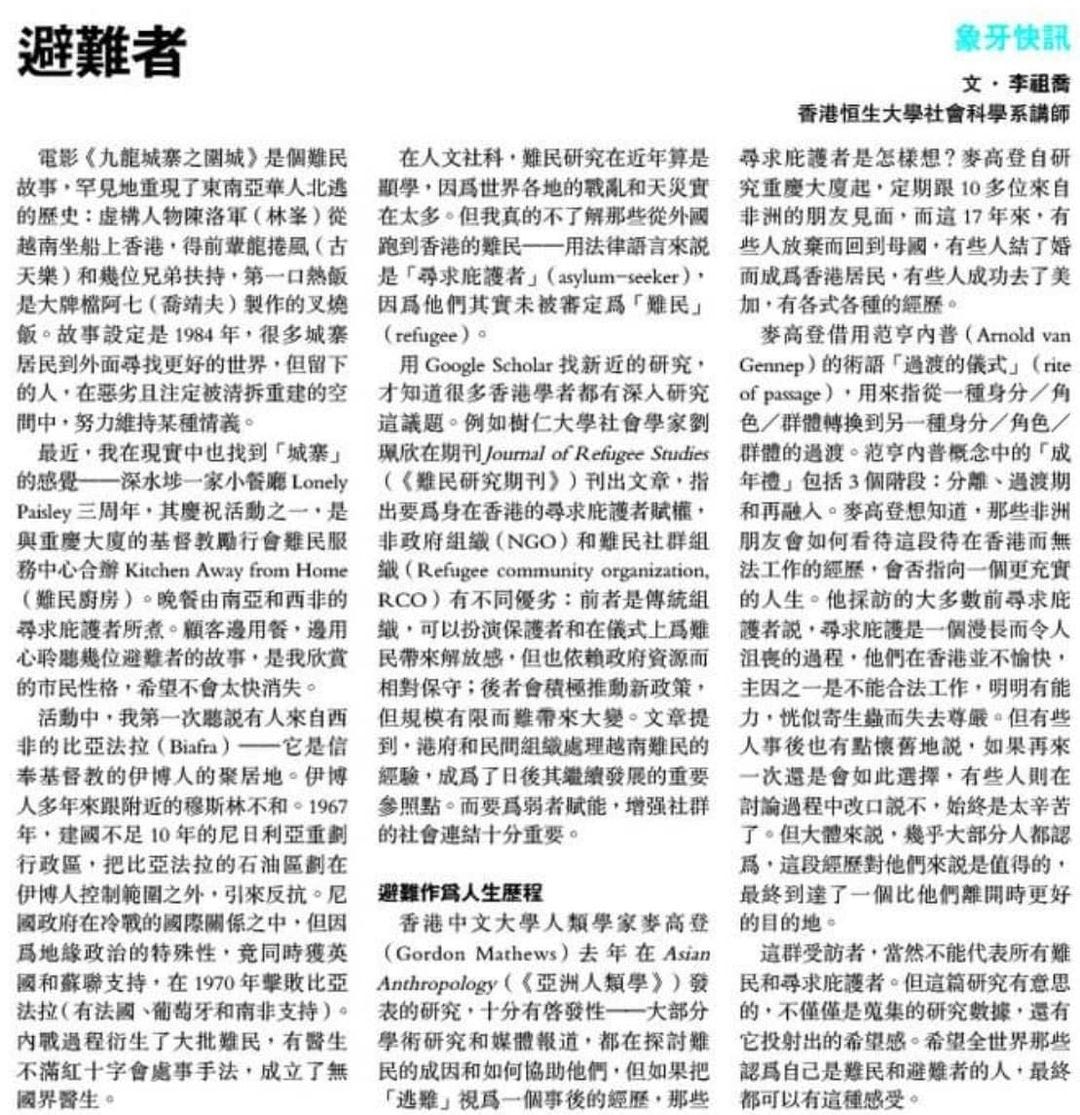 香港中文大學人類學家Gordon Matthews(麥高登)去年在Asian Anthropology(亞洲人類學)發表的研究,十分有啟發性──大部份學術研究和媒體報導,都在探討難民的成因和如何協助他們,但如果把「逃難」視為一個事後的經歷,那些尋求庇護者是怎樣想?麥高登自研究重慶大廈起,定期跟十多位來自非洲的朋友見面,而這十七年來,有些人放棄而回到母國,有些人結了婚而成為香港居民,有些人成功去了美加,有各式各種的經歷。