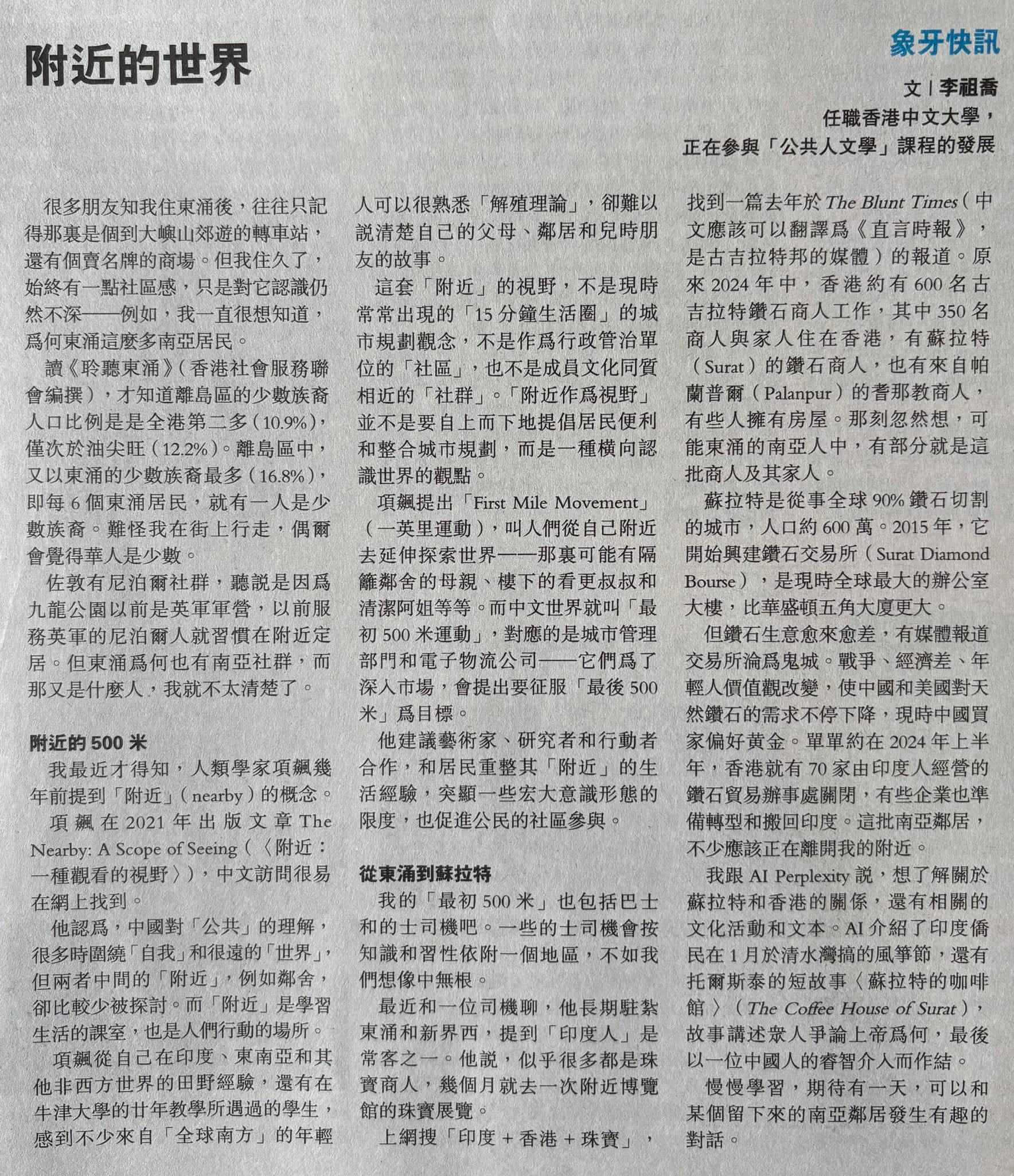 上網搜「印度+香港+珠寶」,找到一篇去年於The Blunt Times(中文應該可以翻譯為《直言時報》,是古吉拉特邦的媒體)的報道。原來2024年中,香港約有600名古吉拉特鑽石商人工作,其中350名商人與家人住在香港,有蘇拉特(Surat)的鑽石商人,也有來自帕蘭普爾(Palanpur)的耆那教商人,有些人擁有房屋。那刻忽然想,可能東涌的南亞人中,有部分就是這批商人及其家人。